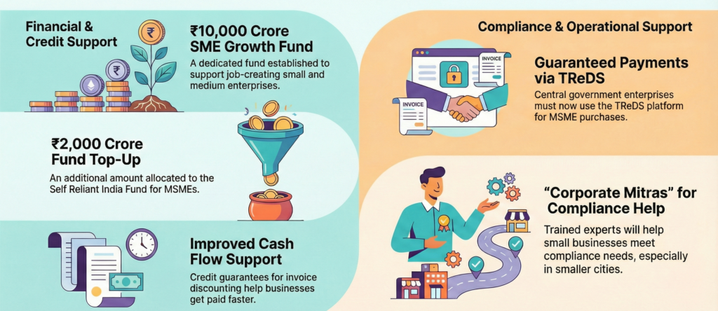 To support job-creating enterprises, the government announced a ₹10,000 crore SME Growth Fund and a ₹2,000 crore top-up to the Self Reliant India Fund. Additional measures include mandatory use of TReDS for CPSE purchases from MSMEs, credit guarantee support for invoice discounting, and training of “Corporate Mitras” to help small businesses meet compliance needs, especially in smaller cities.
