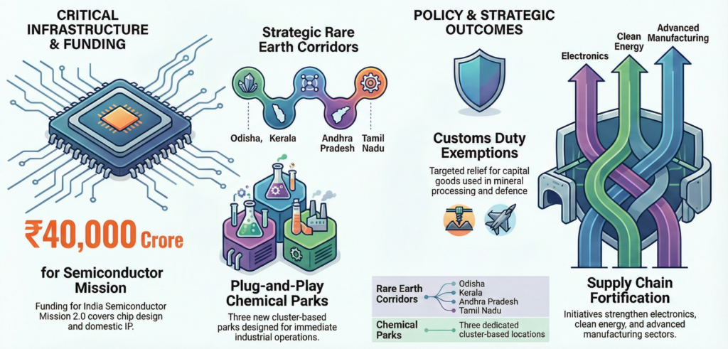 - India Semiconductor Mission (ISM) 2.0 with ₹40,000 crore outlay to support equipment, materials, full-stack chip design and domestic IP