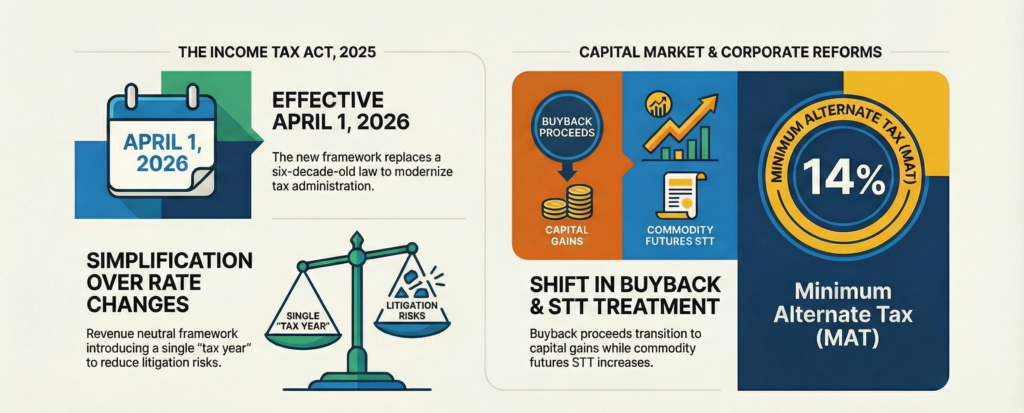 The Income Tax Act, 2025 will come into force from April 1, 2026, replacing the six-decade-old law. The new framework simplifies provisions, introduces a single “tax year,” reduces litigation risk, and is revenue neutral with no change in tax rates.