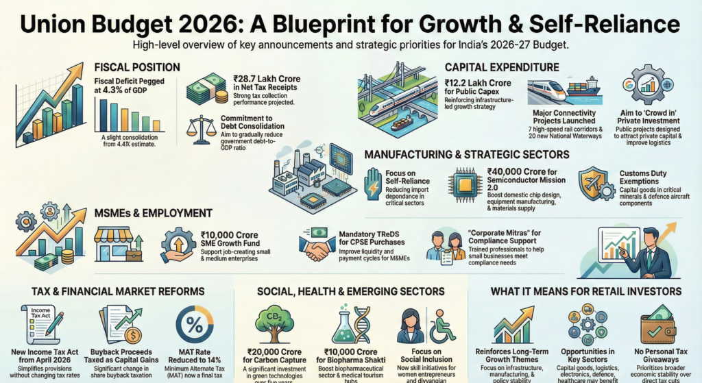 For investors, Budget 2026 reinforces the long-term theme of infrastructure-led growth, manufacturing self-reliance, and policy stability. While there are no headline personal tax giveaways, continued capex, MSME support and sector-specific incentives could create opportunities across capital goods, logistics, electronics, defence and healthcare over the medium to long term.