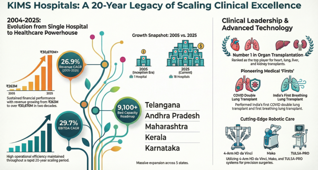 KIMS operates a network of multi-specialty hospitals offering advanced tertiary and quaternary care across specialties including cardiology, oncology, neurology and organ transplantation. The group has expanded into multiple states including Andhra Pradesh, Maharashtra, Kerala and Karnataka, with a capacity exceeding 9,100 beds and a strategy focused on affordable, technology-driven healthcare delivery.