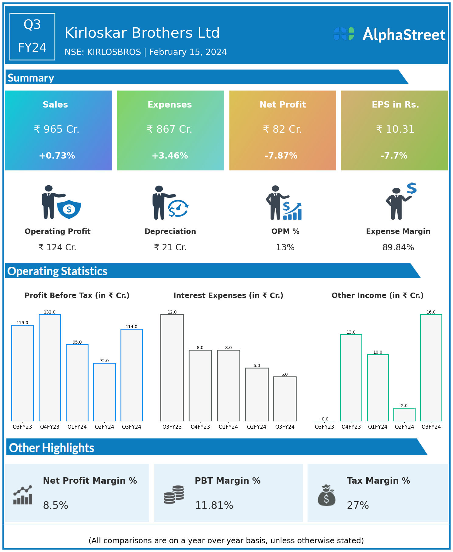 Kirloskar Brothers Ltd reported Revenues for Q3FY24 of ₹965.00 Crores up from ₹958.00 Crore year on year, a rise of 0.73%.