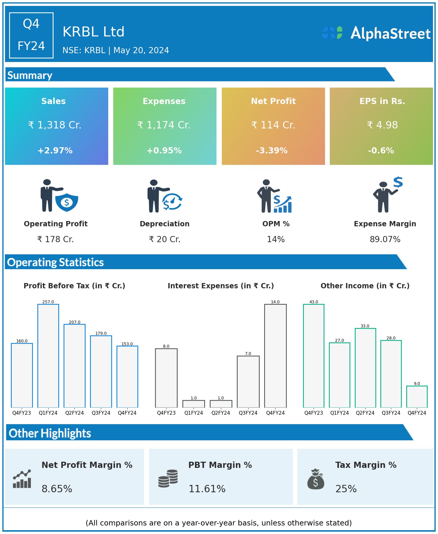 KRBL Ltd reported Revenues for Q4FY24 of ₹1,318.00 Crores up from ₹1,280.00 Crore year on year, a rise of 2.97%.