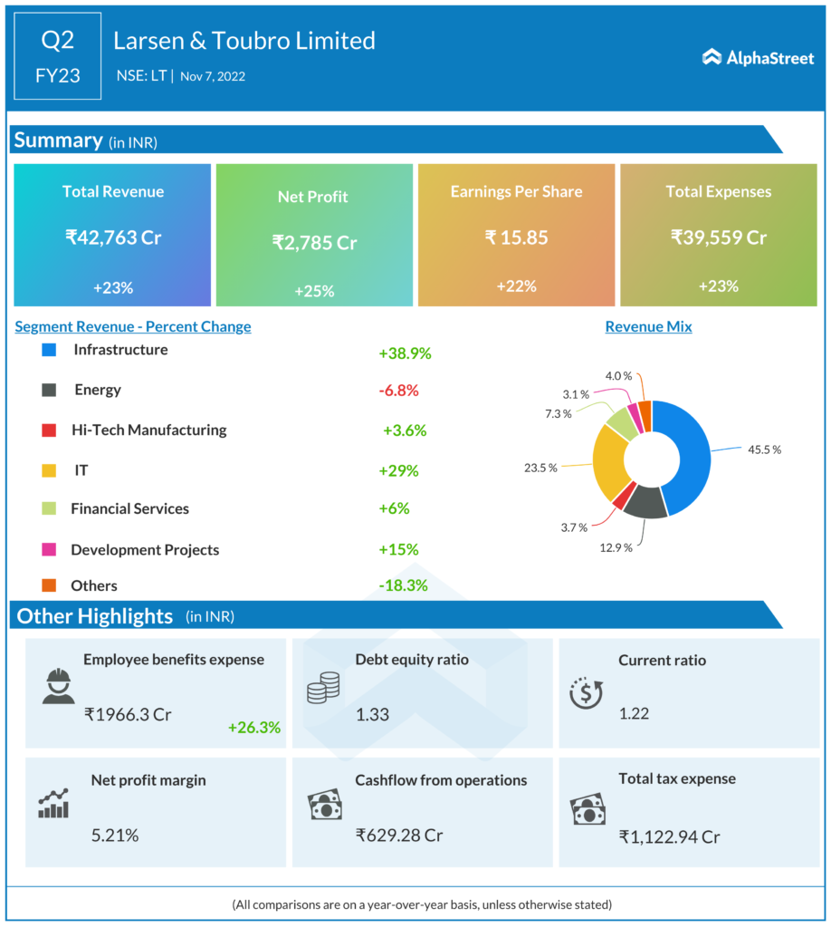 Larsen & Toubro Limited (NSE: LT) reported Revenue from Operations for Q2 FY23 of ₹42,762.61 Crore up from ₹34,772.9 Crore year on year, a growth of 24.7%. Consolidated Net Profit of ₹2,785.26 Crore, up 25% from ₹2,231.96 Crore in the same quarter of the previous year. The Earnings per Share is ₹15.85 for this quarter.