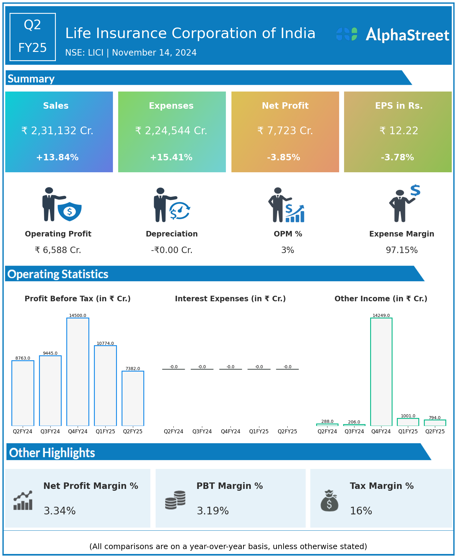 Life Insurance Corporation of India reported Revenues for Q2FY25 of ₹2,31,132.00 Crores up from ₹2,03,033.00 Crore year on year, a rise of 13.84%.