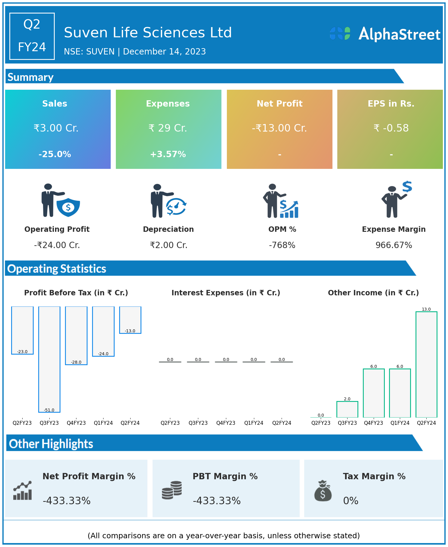 Suven Life Sciences Ltd reported Revenues for Q2FY24 of ₹3.00 Crores down from ₹4.00 Crore year on year, a fall of 25.0%.