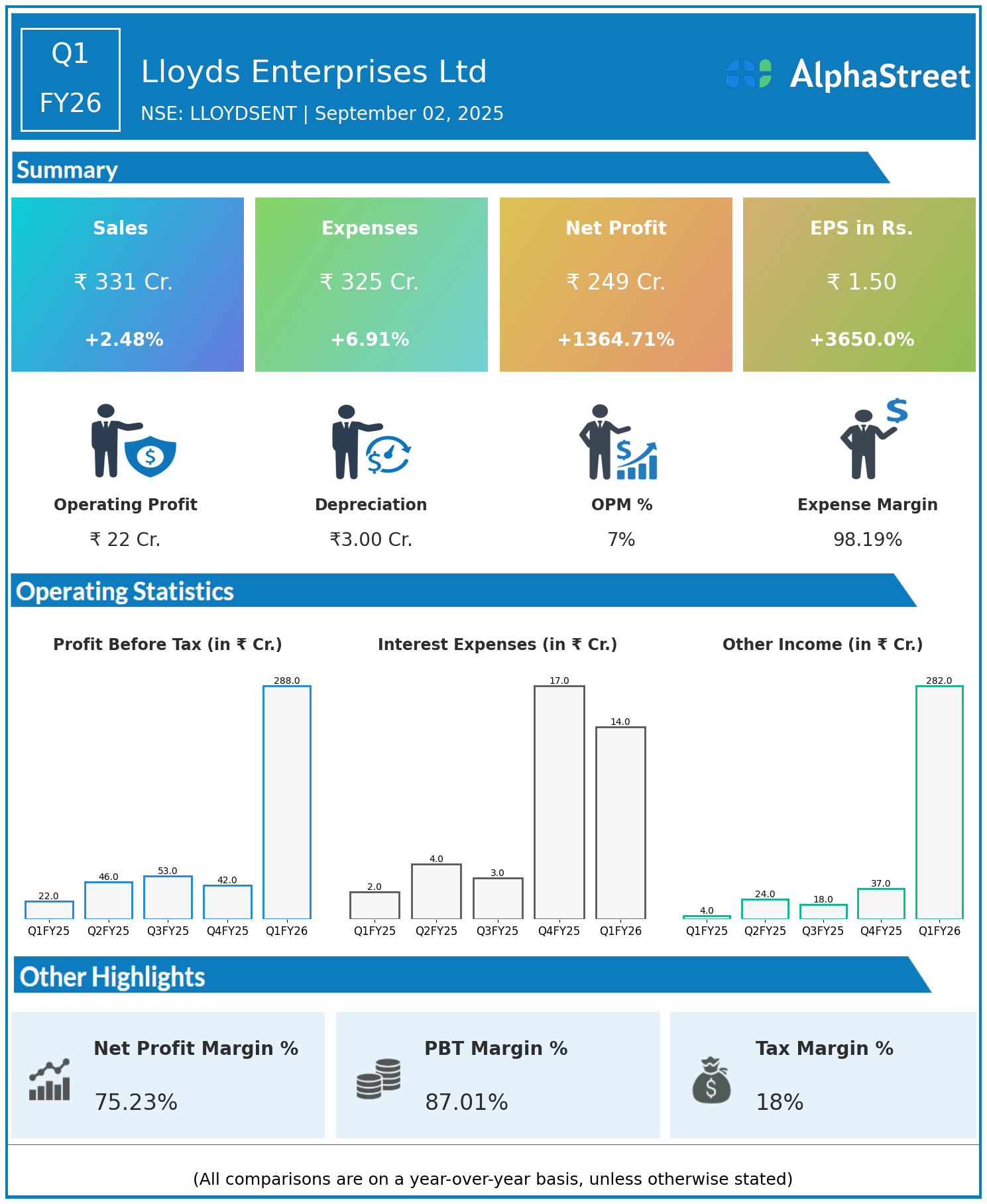 Profit Before Tax (PBT): ₹287.54 crores, up 386.4% QoQ (Q4 FY25: ₹59.11 crores) and 1230.0% YoY (Q1 FY25: ₹21.62 crores).