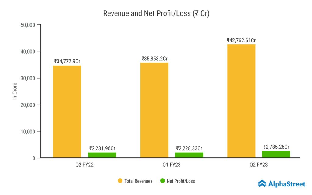 Larsen & Toubro Limited reported Revenue from Operations for Q2 FY23 of ₹42,762.61 Crore up from ₹34,772.9 Crore year on year, a growth of 24.7%. The Revenue was driven by Infrastructure segment which surged by 38.9% up to ₹18,476.45 Crore. Consolidated Net Profit of ₹2,785.26 Crore, up 25% from ₹2,231.96 Crore in the same quarter of the previous year. The Earnings per Share is ₹15.85 for this quarter. As of September 2022, L&T’s order book is at a record high of ₹3.72 trillion, of which 72% was domestic and 28% was foreign.