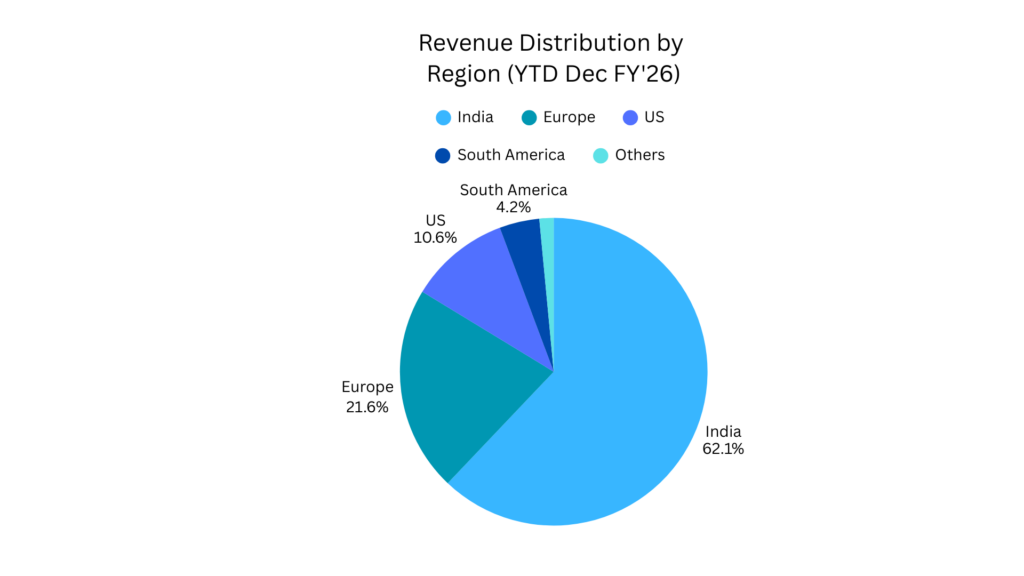 - Geographic Revenue Split: India accounts for 62.1% of overall sales, followed by Europe at 21.6% and the US at 10.6%.