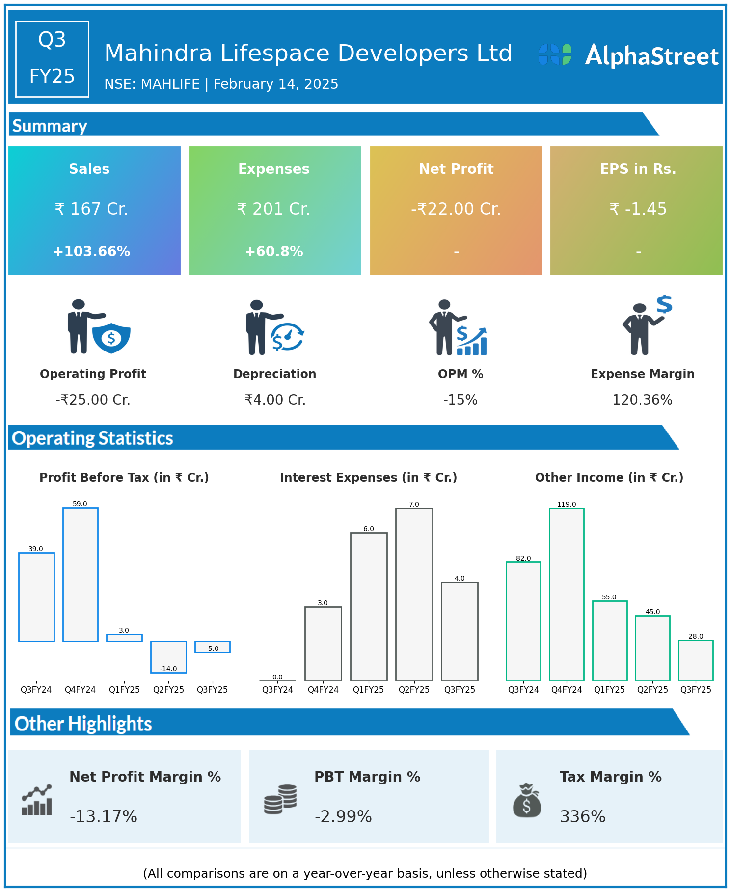 Mahindra Lifespace Developers Ltd reported Revenues for Q3FY25 of ₹167.00 Crores up from ₹82.00 Crore year on year, a rise of 103.66%.