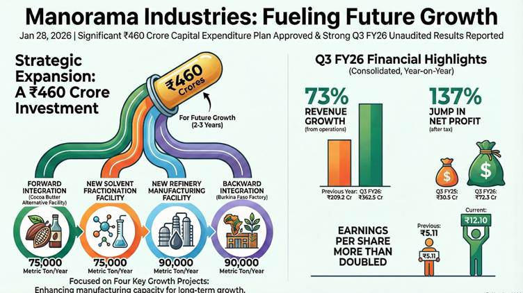 Manorama Industries Ltd. (MANORAMA.NS) on Tuesday reported a 32% rise in consolidated net profit for the December quarter, supported by higher revenue, while its board approved a multi-year capacity expansion plan.