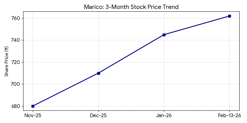Marico Limited (NSE: MARICO; BSE: 531642) shares closed 1.07% lower at ₹762.45 on Friday. The FMCG major reported steady profit growth for the quarter ended December 31, 2025, supported by volume gains across domestic and international markets.