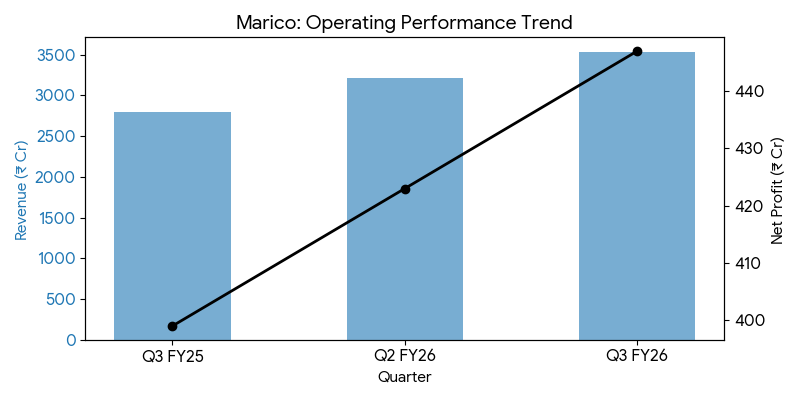 Marico shares closed at ₹762.45. Q3 revenue surged 26.6% to ₹3,537 Cr. Net profit rose 12% with international markets contributing significantly.