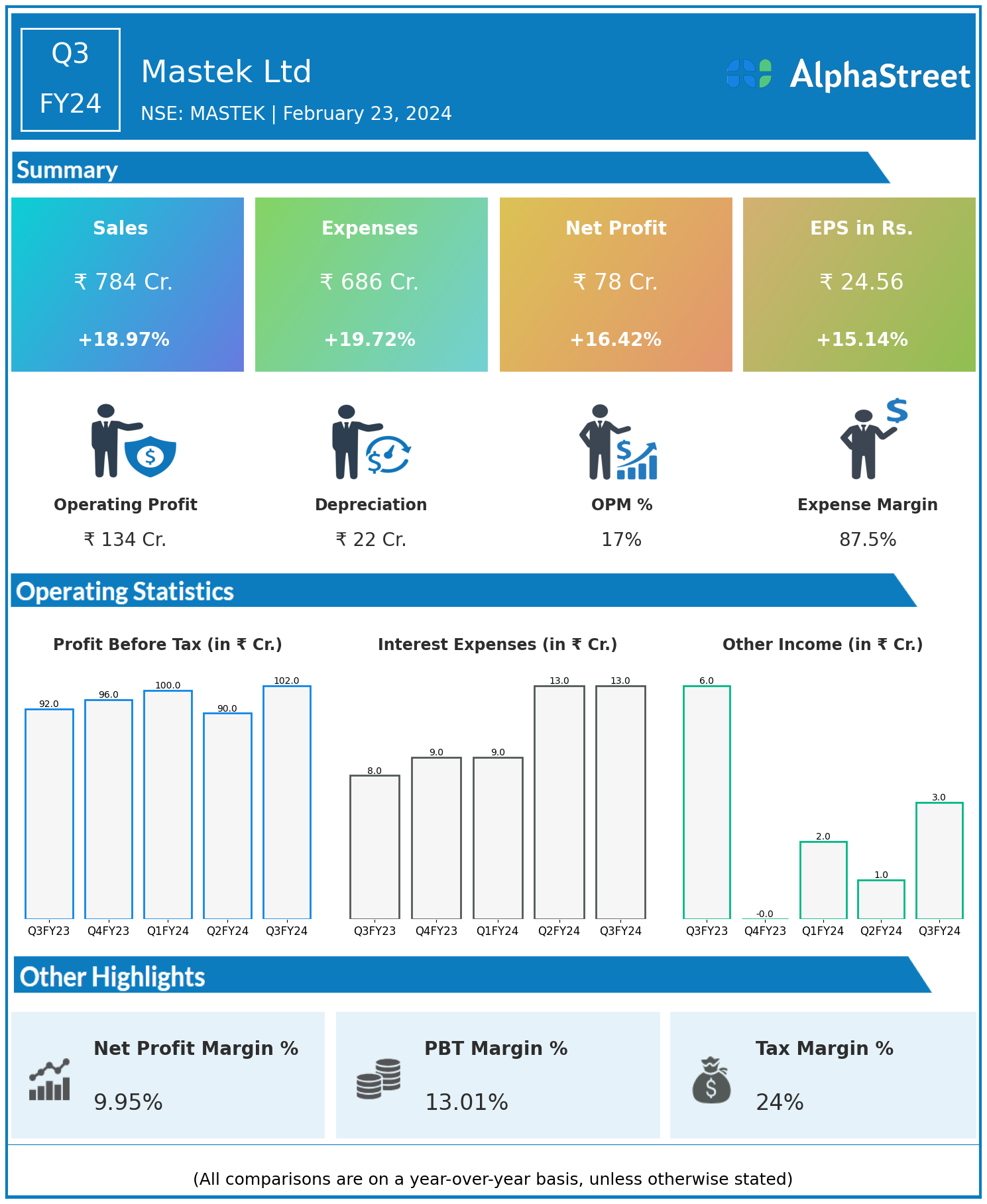 Mastek Ltd reported Revenues for Q3FY24 of ₹784.00 Crores up from ₹659.00 Crore year on year, a rise of 18.97%.