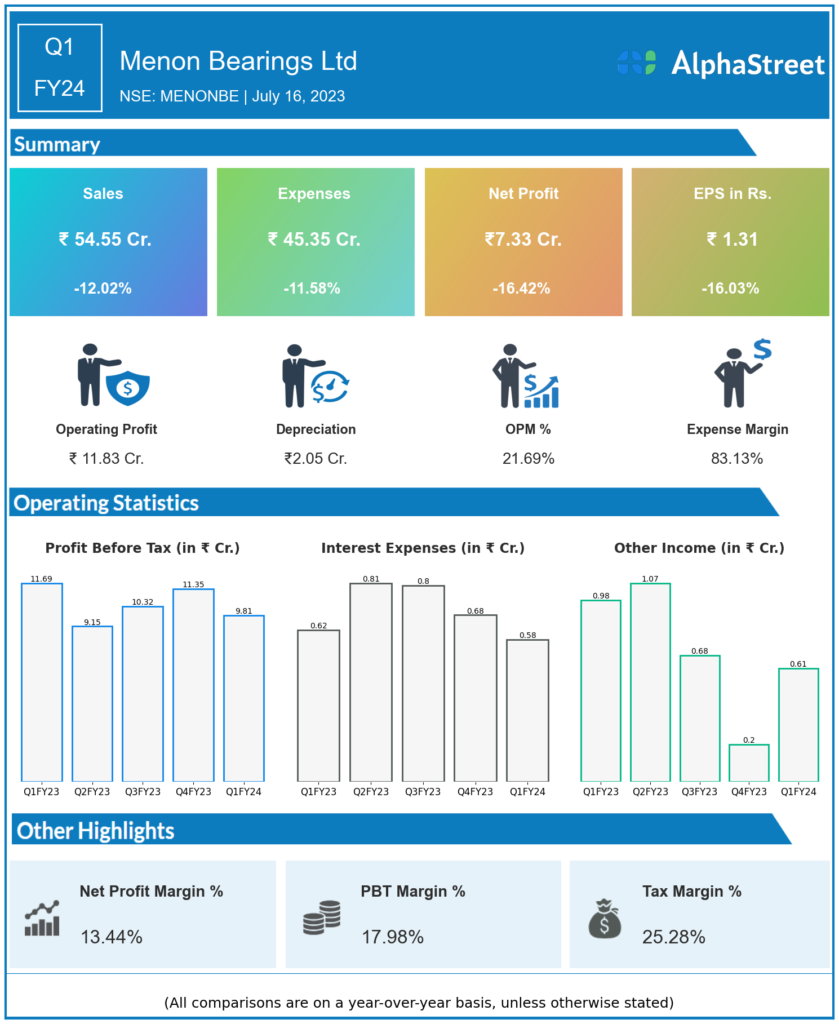 Menon Bearings Ltd reported Revenues for Q1FY24 of ₹54.55 Crores down from ₹62.00 Crore year on year, a fall of 12.02%.