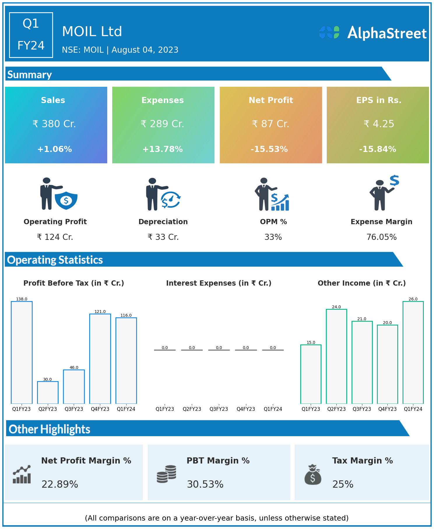 MOIL Ltd reported Revenues for Q1FY24 of ₹380.00 Crores up from ₹376.00 Crore year on year, a rise of 1.06%.