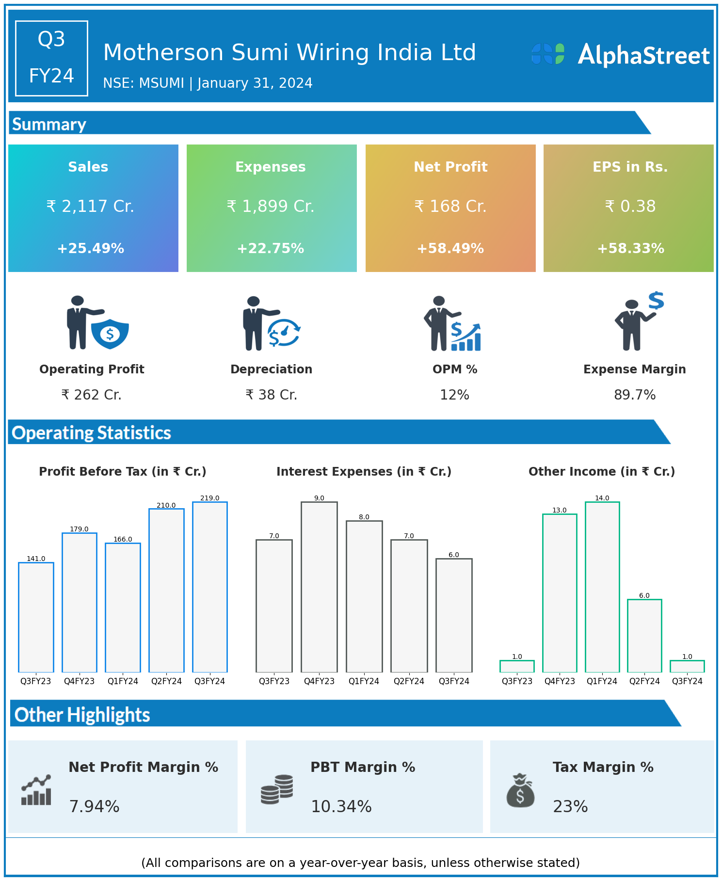 Motherson Sumi Wiring India Ltd reported Revenues for Q3FY24 of ₹2,117.00 Crores up from ₹1,687.00 Crore year on year, a rise of 25.49%.