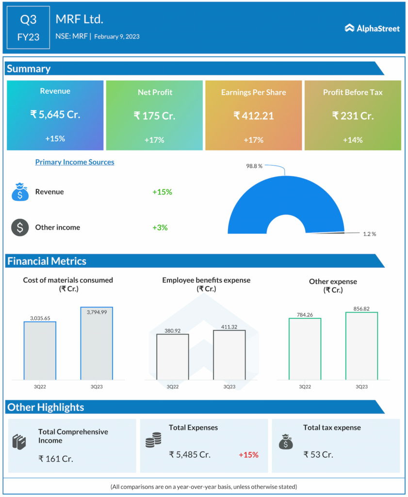 MRF Ltd.’s revenue in Q3FY23 rose 15% to ₹ 5,645 millions. Consolidated Profit After Tax came at ₹ 175 crores in Q3FY23 showcasing a 17% rise on an YoY basis. In this quarter’s results, the reports suggested that the firm has continued to deliver consistent performance in all key operational and financial indicators in Q3Y23.