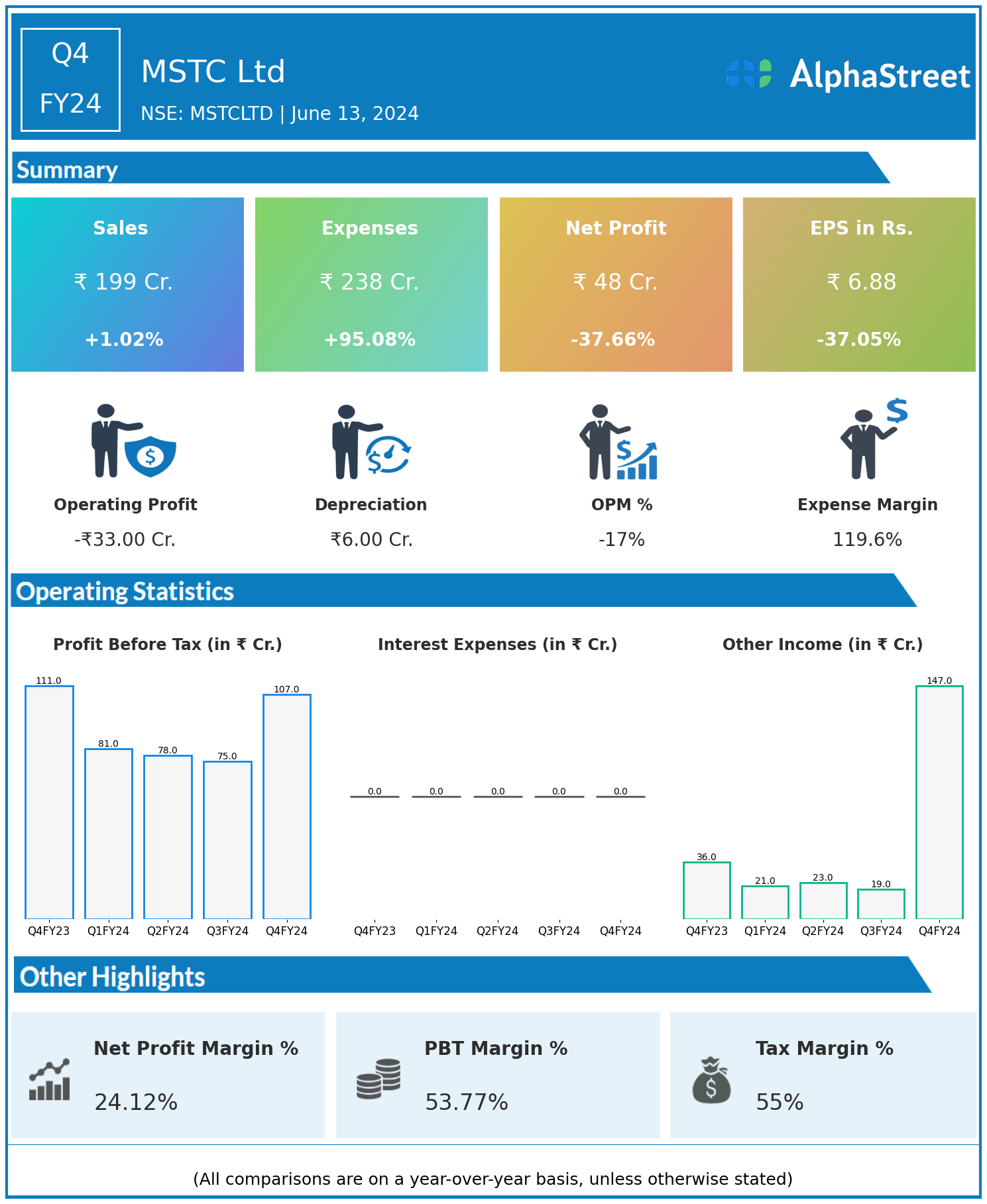 MSTC Ltd reported Revenues for Q4FY24 of ₹199.00 Crores up from ₹197.00 Crore year on year, a rise of 1.02%.