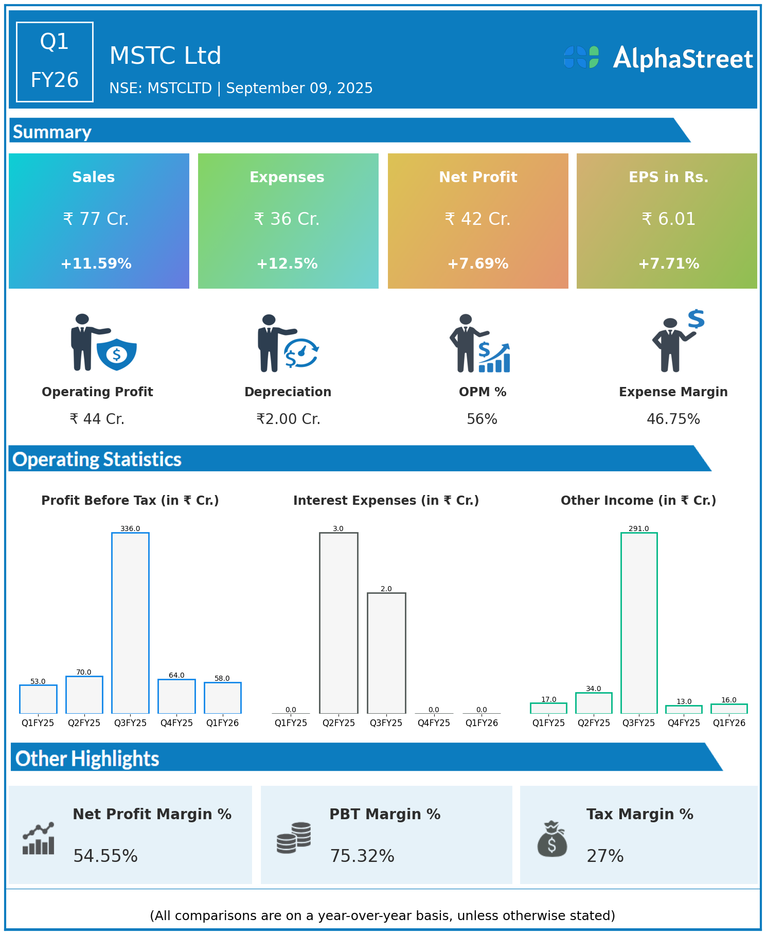 MSTC (Metal Scrap Trade Corporation) Ltd undertakes trading activities, e-commerce and also disposal of ferrous and non-ferrous scrap, surplus stores, minerals, agri and forest products, etc. The company is owned and controlled by the Government of India. Presenting below are its Q1 FY26 earnings results.