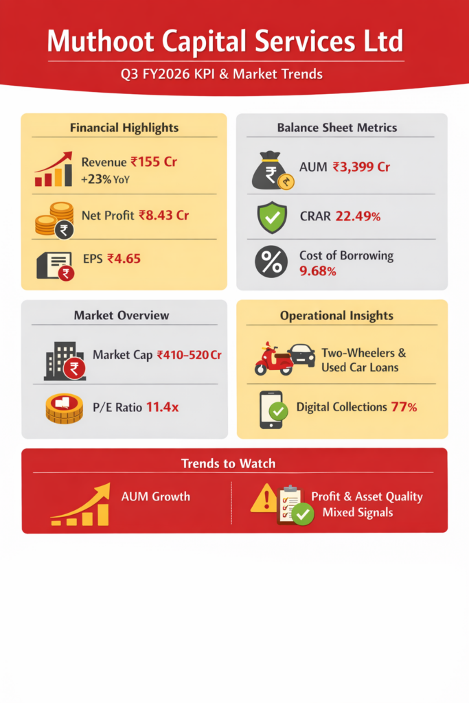 Muthoot Capital Services Limited (MCSL), the non-banking financial company reported a sequential recovery in disbursements to ₹626 crore for the quarter ended December 31, 2025. While net interest income increased to ₹73.92 crore, net non-performing asset ratios rose to 3.64%.