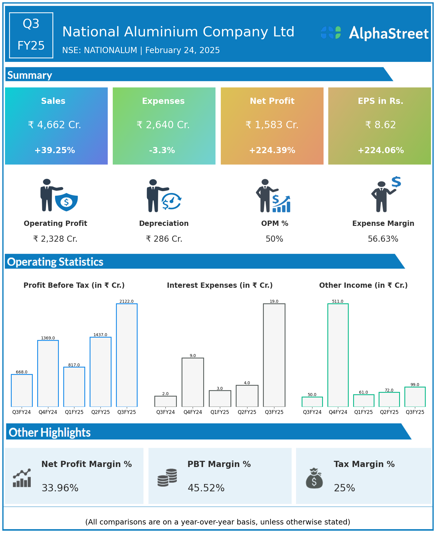 National Aluminium Company Ltd reported Revenues for Q3FY25 of ₹4,662.00 Crores up from ₹3,348.00 Crore year on year, a rise of 39.25%.