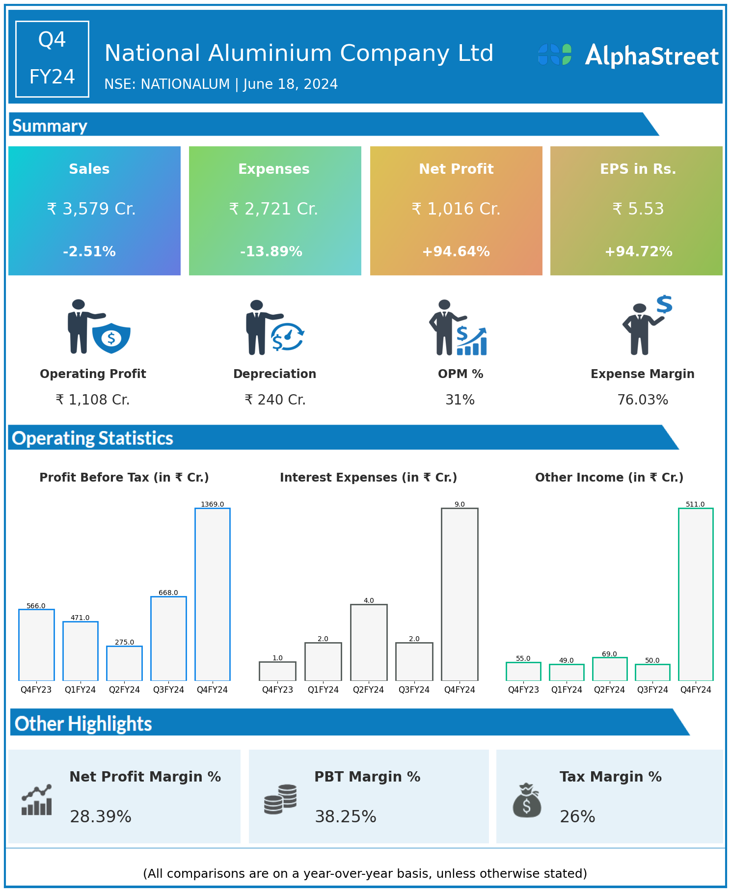 National Aluminium Company Ltd reported Revenues for Q4FY24 of ₹3,579.00 Crores down from ₹3,671.00 Crore year on year, a fall of 2.51%.
