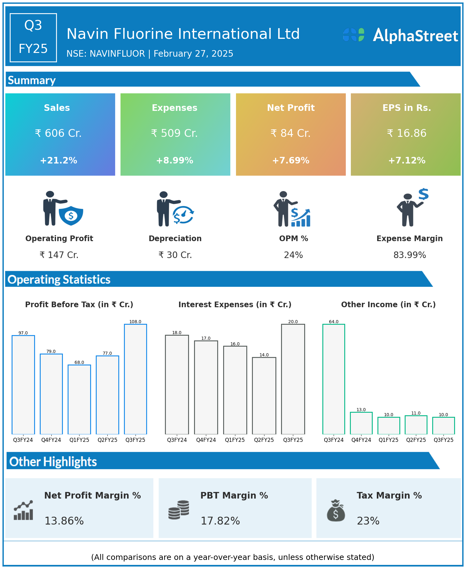 Navin Fluorine International Ltd reported Revenues for Q3FY25 of ₹606.00 Crores up from ₹500.00 Crore year on year, a rise of 21.2%.