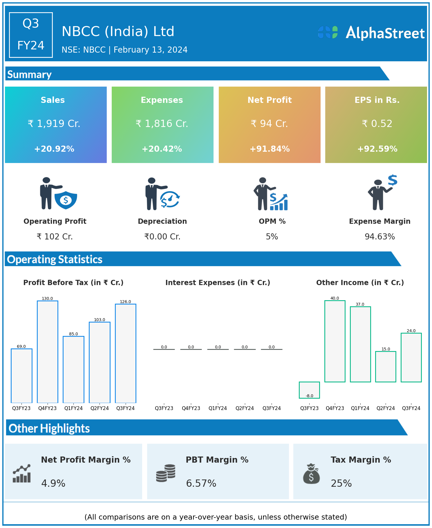 NBCC (India) Ltd reported Revenues for Q3FY24 of ₹1,919.00 Crores up from ₹1,587.00 Crore year on year, a rise of 20.92%.