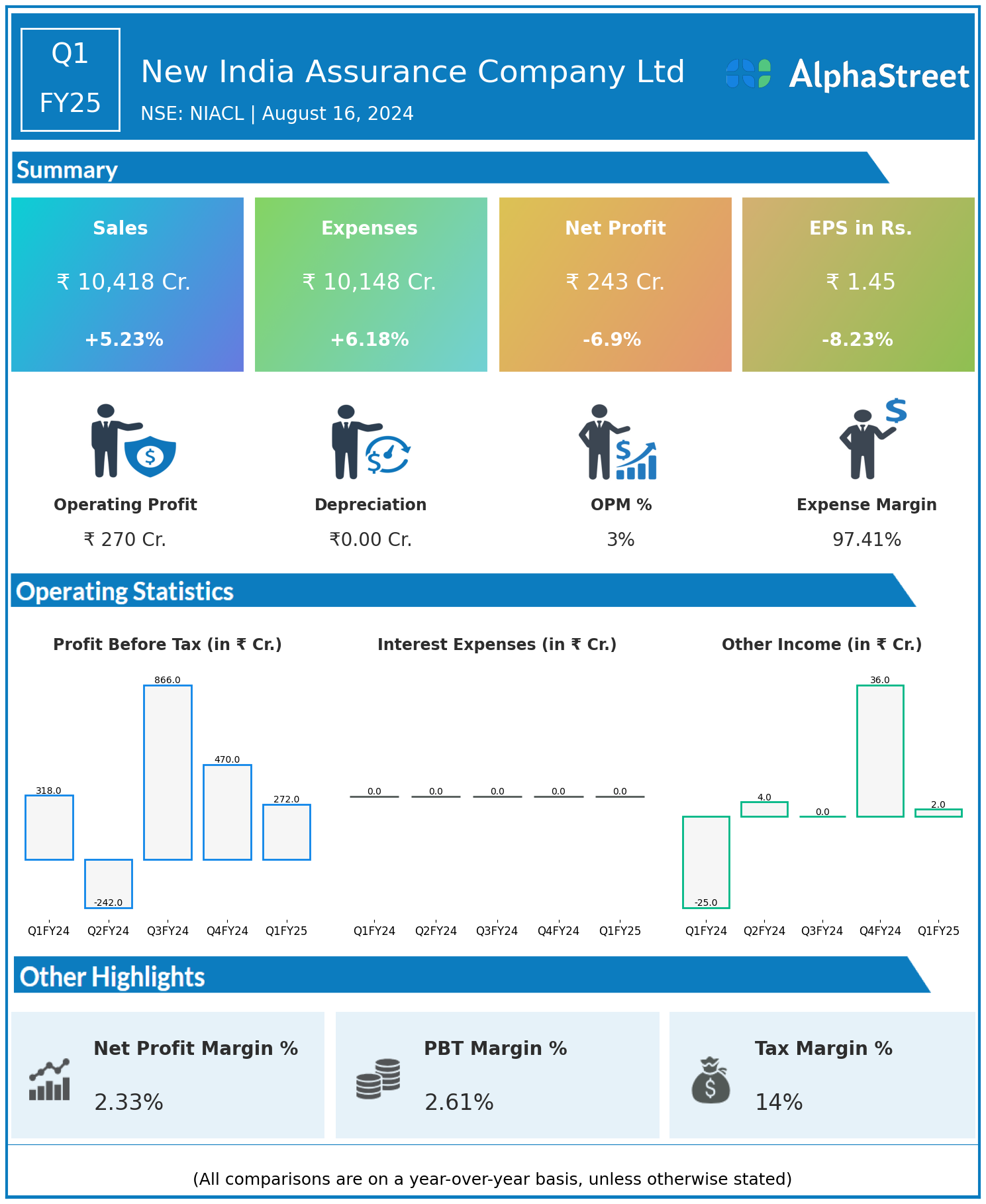 New India Assurance Company Ltd reported Revenues for Q1FY25 of ₹10,418.00 Crores up from ₹9,900.00 Crore year on year, a rise of 5.23%.