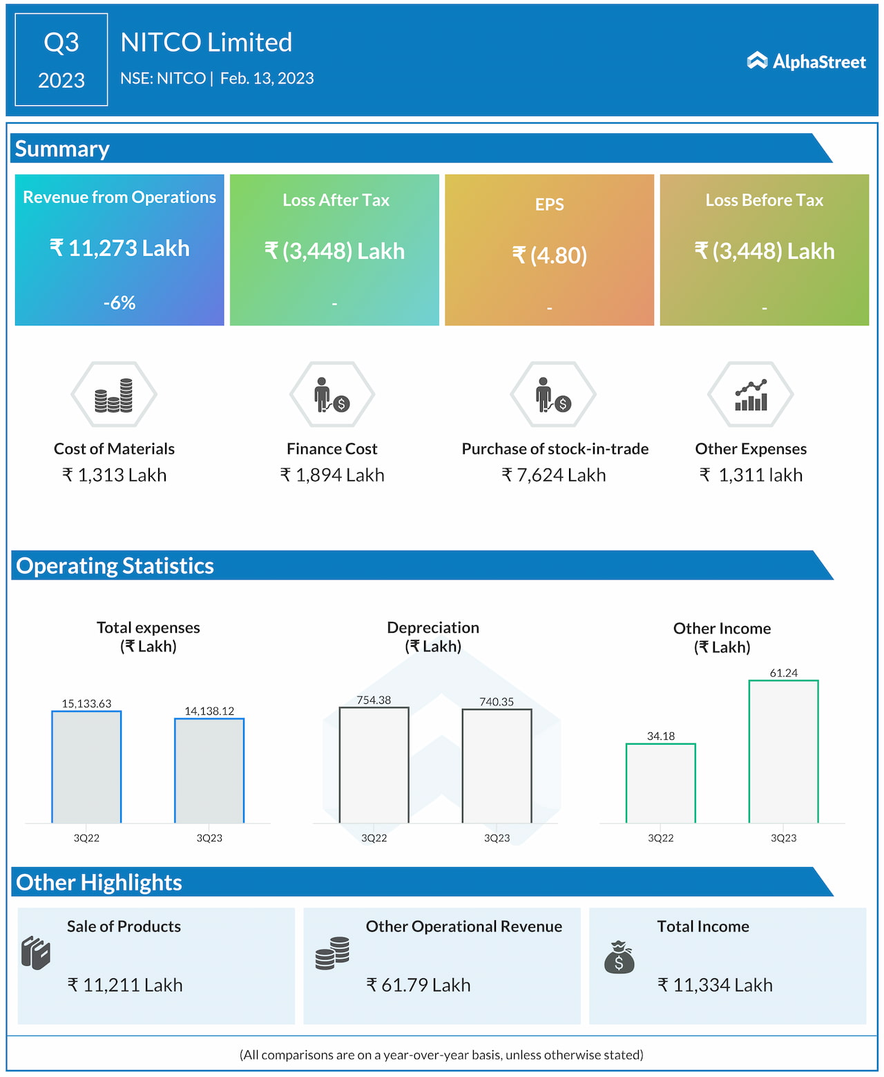 NITCO Limited’s revenue in Q3FY23 fell 6% to ₹ 11,273 lakhs. Consolidated Loss After Tax came at ₹ 3,448 lakhs in Q3FY23. In this quarter’s results, the reports suggested that the firm has reported decreased profits due to a high level of expenses.