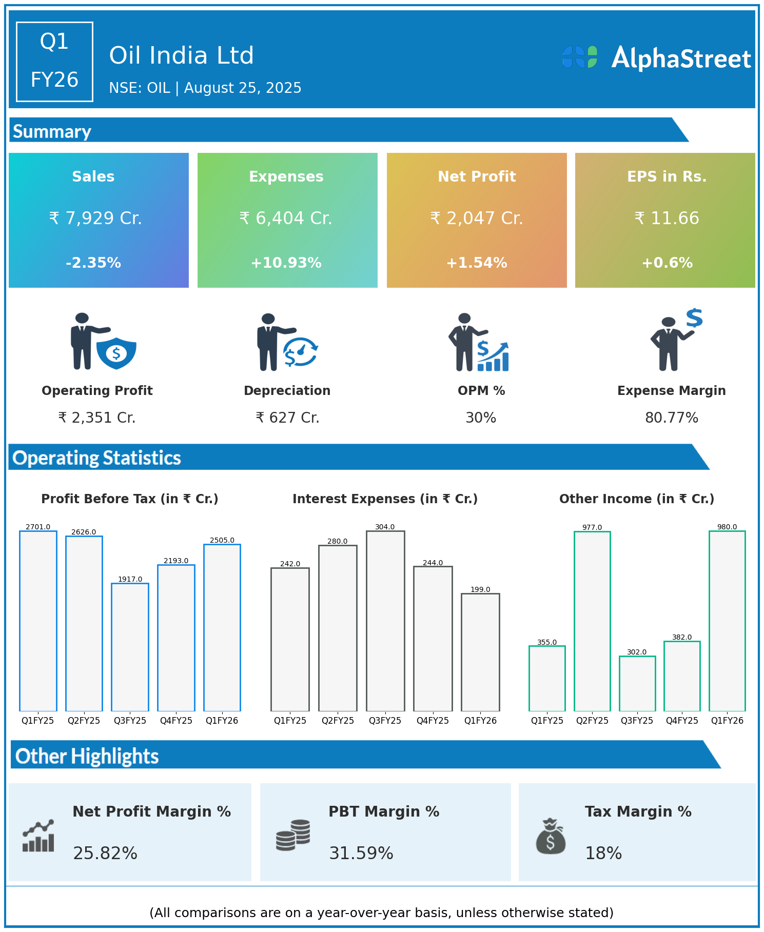 Oil India Ltd is engaged in exploration, development and production of crude oil and natural gas, transportation of crude oil and production of LPG. It also provides various E&P related services for oil blocks. Presenting below are its Q1 FY26 earnings results.