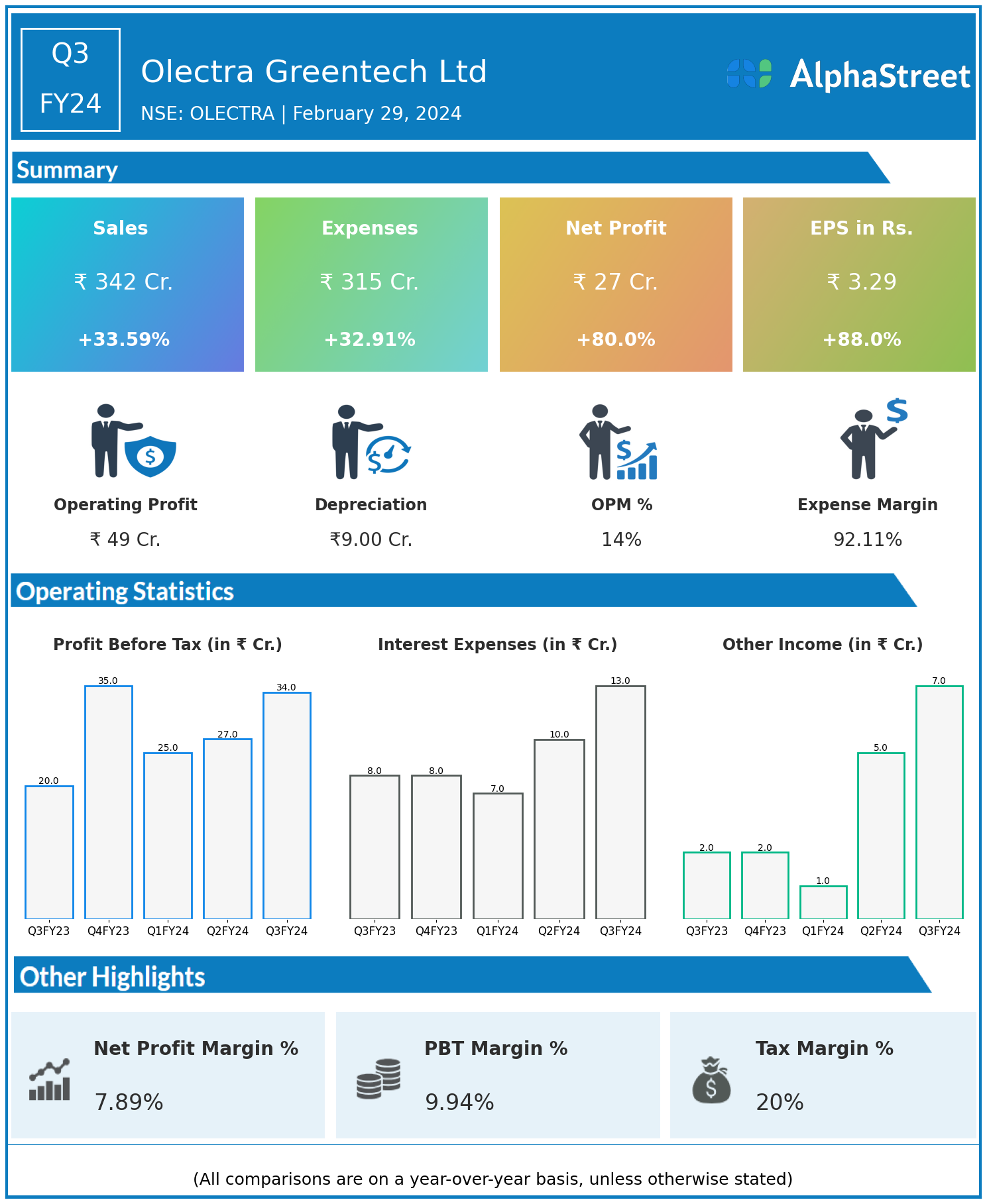 Olectra Greentech Ltd reported Revenues for Q3FY24 of ₹342.00 Crores up from ₹256.00 Crore year on year, a rise of 33.59%.