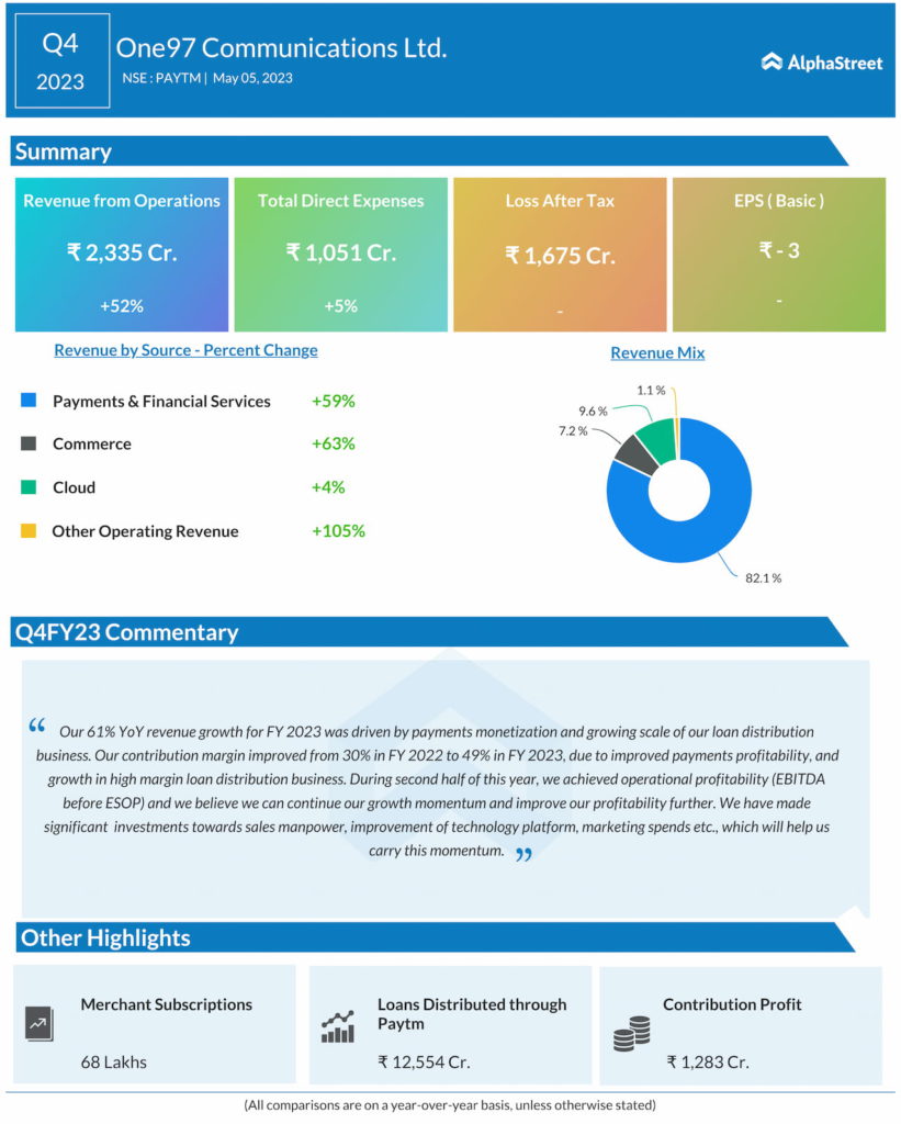 One 97 Communications Ltd’s revenue in Q4FY23 rose 52% to ₹ 2,335 crores. Consolidated Loss After Tax came at ₹ 1,675 crores in Q4FY23. In this quarter’s results, the reports suggested that the firm has continued to deliver consistent performance in all key operational indicators in Q4Y23.