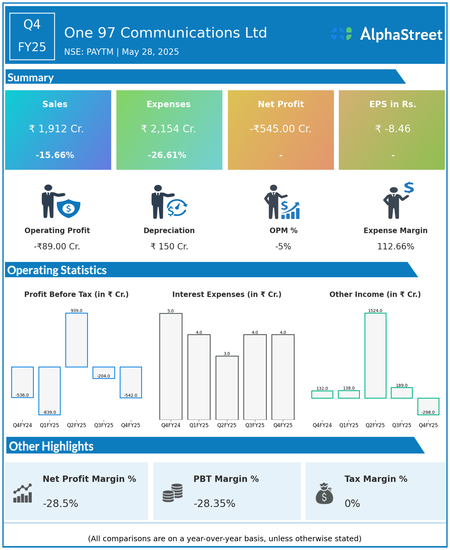 One 97 Communications Ltd reported Revenues for Q4FY25 of ₹1,912.00 Crores down from ₹2,267.00 Crore year on year, a fall of 15.66%.