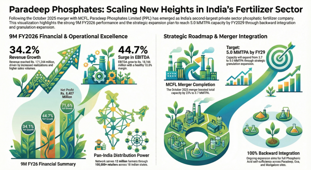 Paradeep Phosphates Ltd (BSE: 543530, NSE: PARADEEP) continues to solidify its position as a cornerstone of India’s agricultural sector, reporting robust financial results for the nine months ended December 31, 2025 (9M FY26). Following the successful completion of the MCFL merger in October 2025, PPL has emerged as India’s second-largest private sector phosphatic fertilizer company, boasting a total capacity of 3.7 MMTPA.