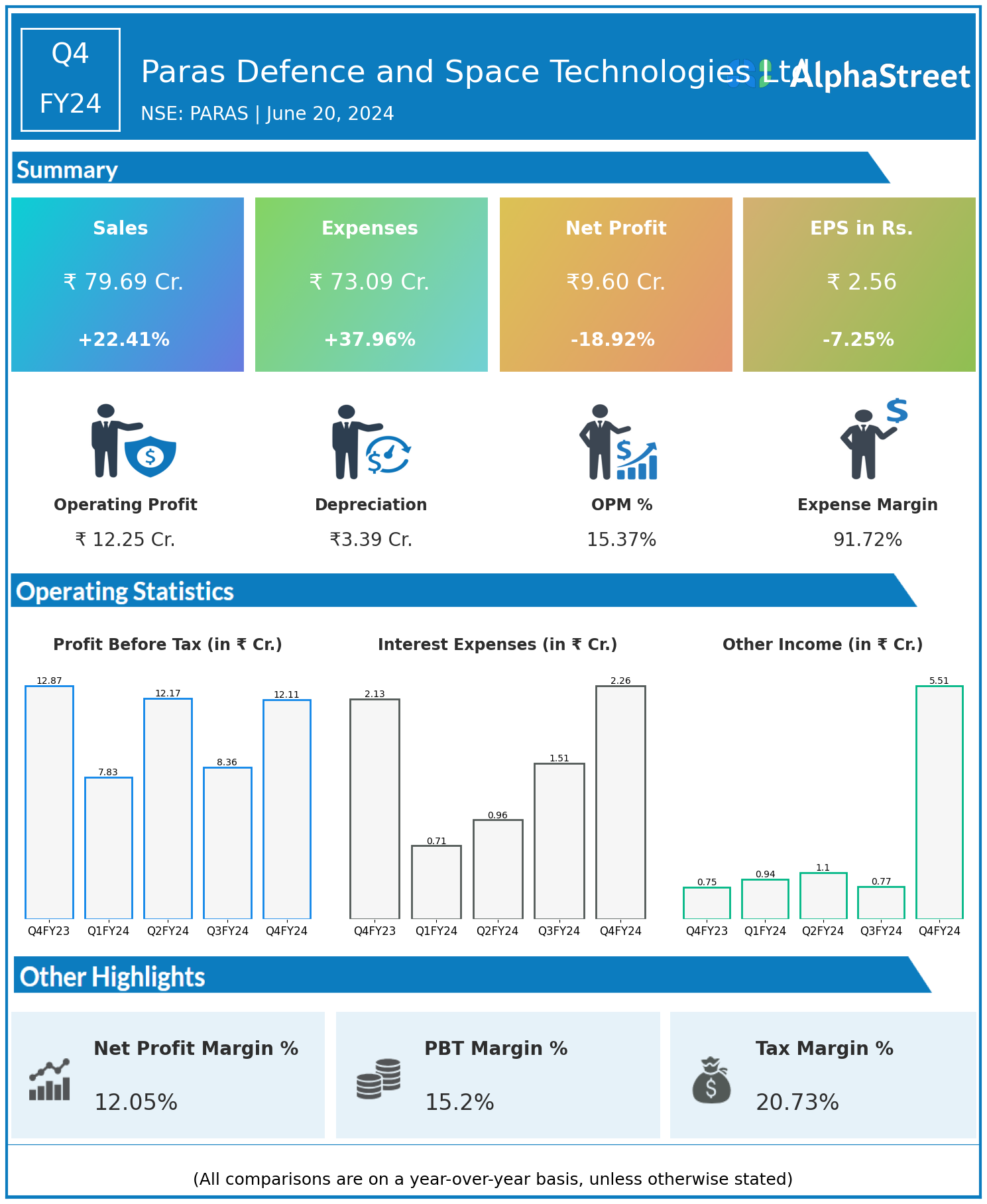 Paras Defence and Space Technologies Ltd reported Revenues for Q4FY24 of ₹79.69 Crores up from ₹65.10 Crore year on year, a rise of 22.41%.