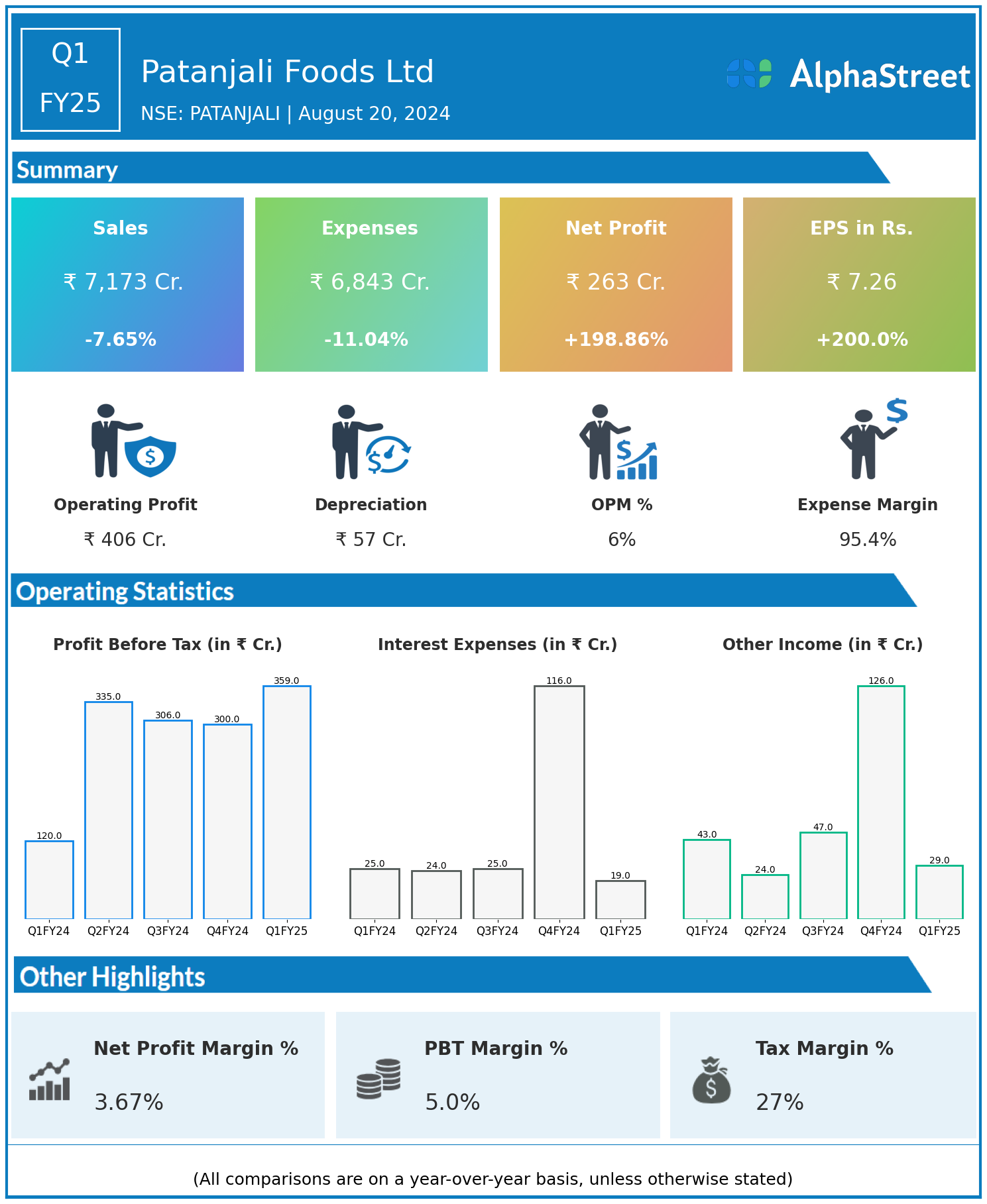 Patanjali Foods Ltd reported Revenues for Q1FY25 of ₹7,173.00 Crores down from ₹7,767.00 Crore year on year, a fall of 7.65%.