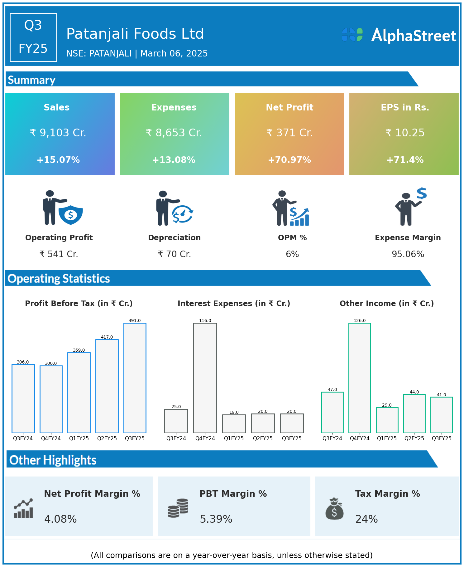 Patanjali Foods Ltd reported Revenues for Q3FY25 of ₹9,103.00 Crores up from ₹7,911.00 Crore year on year, a rise of 15.07%.