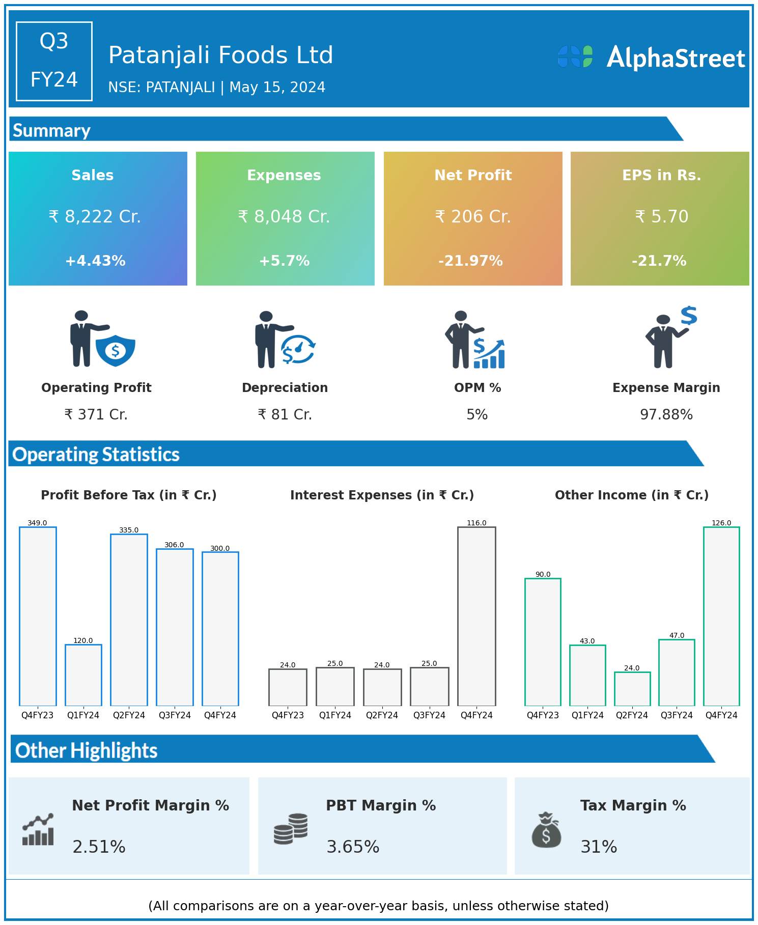 Patanjali Foods Ltd reported Revenues for Q4FY24 of ₹8,222.00 Crores up from ₹7,873.00 Crore year on year, a rise of 4.43%.