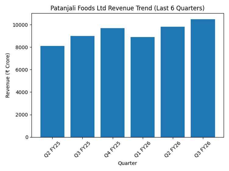 Patanjali Foods Ltd (NSE: PATANJALI, BSE: 500368) reports revenue from operations of ₹10,483.71 crore in Q3 FY26, up 16.53% year-on-year. Profit before tax stands at ₹364.54 crore, translating into a margin of 3.46%. The quarter includes an exceptional item of ₹30.19 crore related to labor code implementation.
