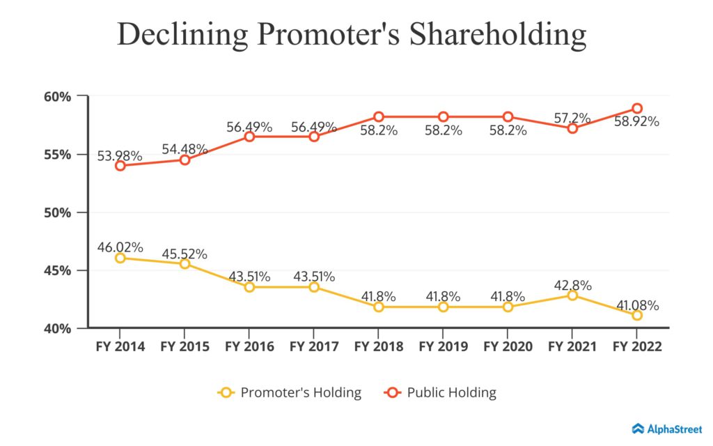 The promoters’ shareholdings decreased from 46.02% to 41.08% over the past nine years. Currently, individual shareholders make up the majority of the 58.92% public shareholding. The Institutional Investors, specifically mutual funds holding was only 0.06% by FY18. As of FY22, the mutual funds have not expressed interest in this stock and have no holdings in the company.