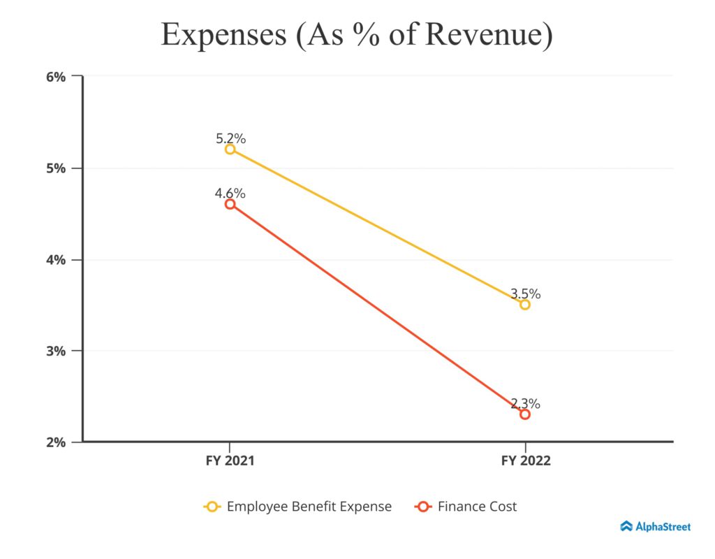 The company’s operating revenue decreased by more than 50% between FY17 and FY21. However, between FY21 and FY22, operating revenue increased by 10.3%, going from 21225 lakhs to 23401 lakhs. In the same time frame, the net profit multiplied year over year, rising from 5 lakhs to 227 lakhs. Reductions in finance costs and employee benefit expenses were the main drivers of the net profit growth. Refer to the graph below: