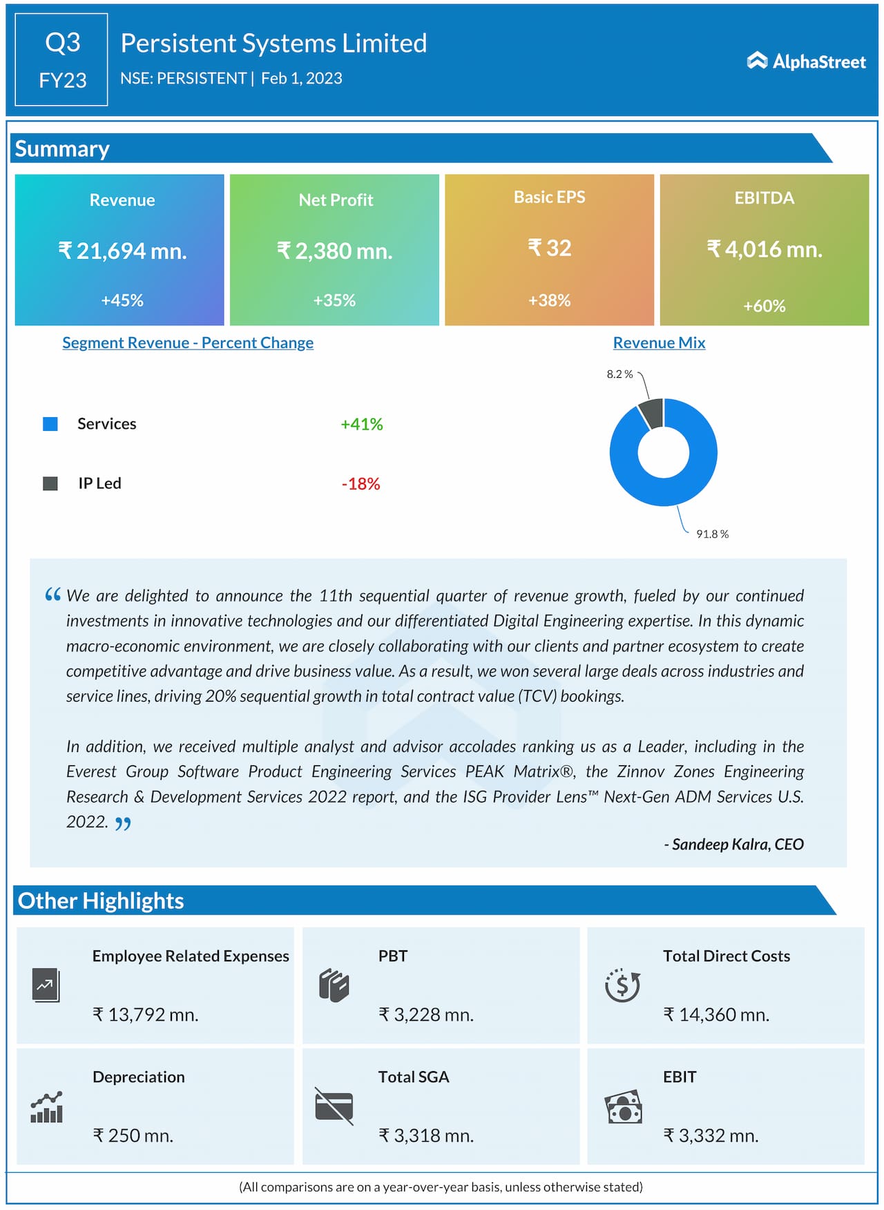 Persistent Systems Limited’s revenue in Q3FY23 rose 45% to ₹ 21,694 millions. Consolidated Profit After Tax came at ₹ 2,380 million in Q3FY23. In this quarter’s results, the reports suggested that the firm has continued to deliver consistent performance in all key operational and financial indicators in Q3Y23.