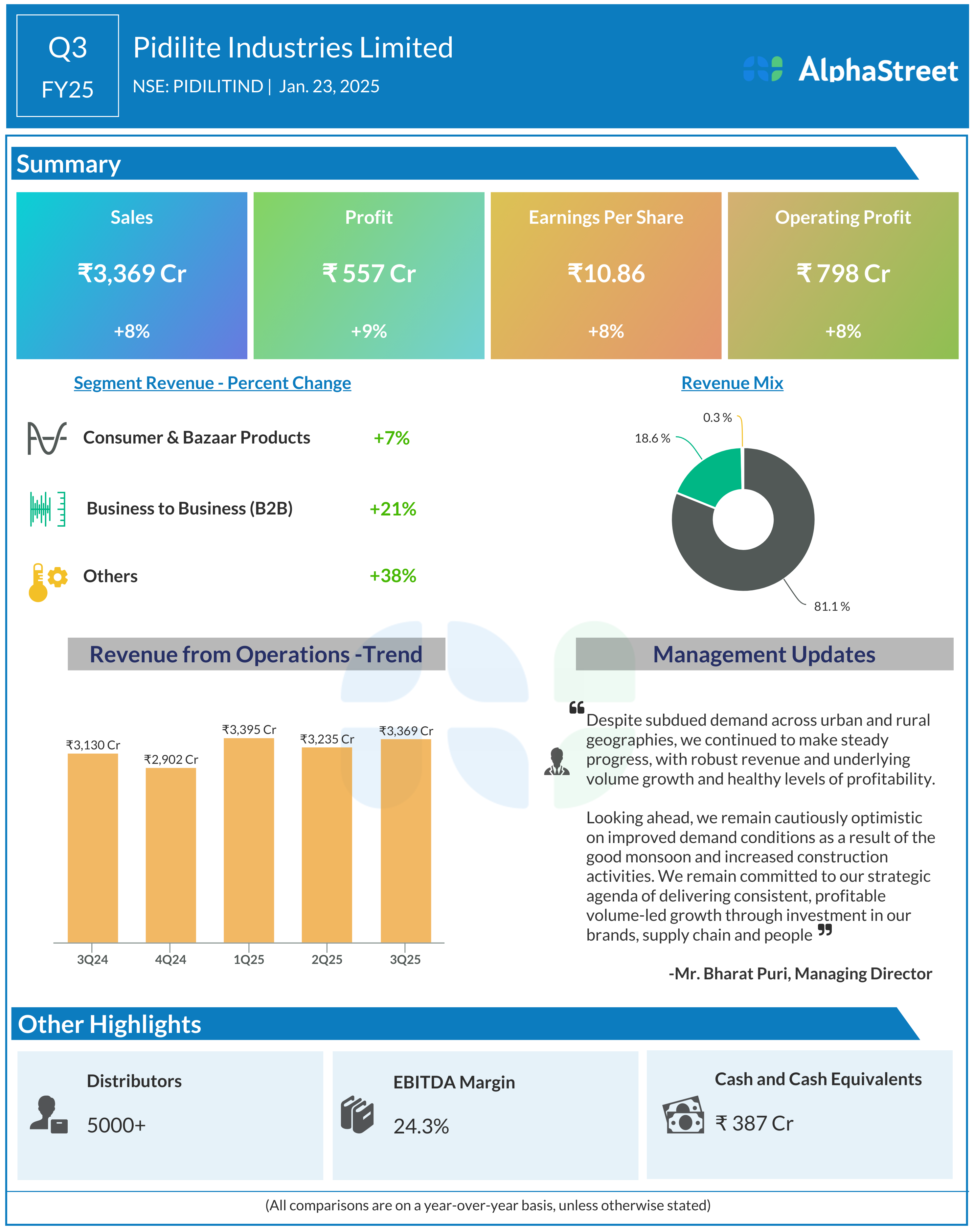 Pidilite Industries Ltd reported Revenues for Q3FY25 of ₹3,369.00 Crores up from ₹3,130.00 Crore year on year, a rise of 7.64%.