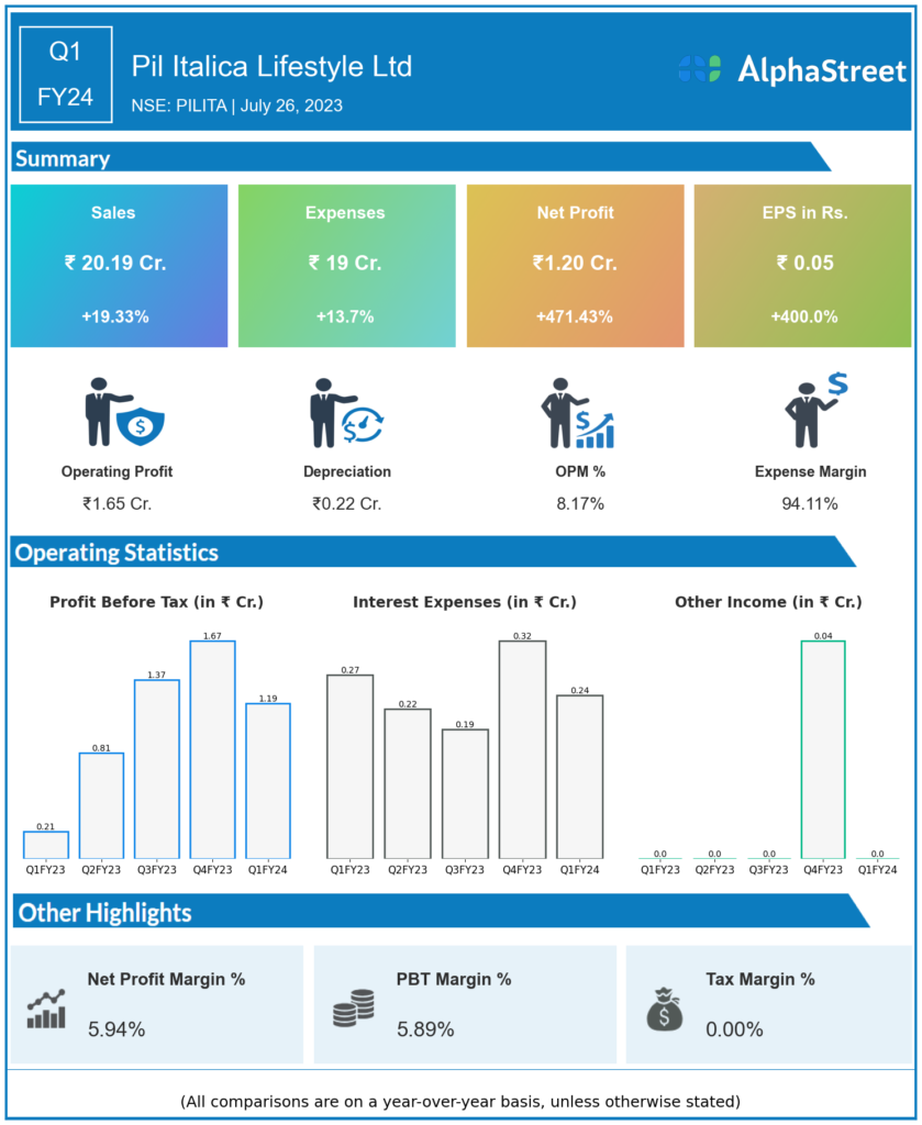 Pil Italica Lifestyle Ltd reported Revenues for Q1FY24 of ₹20.19 Crores up from ₹16.92 Crore year on year, a rise of 19.33%.