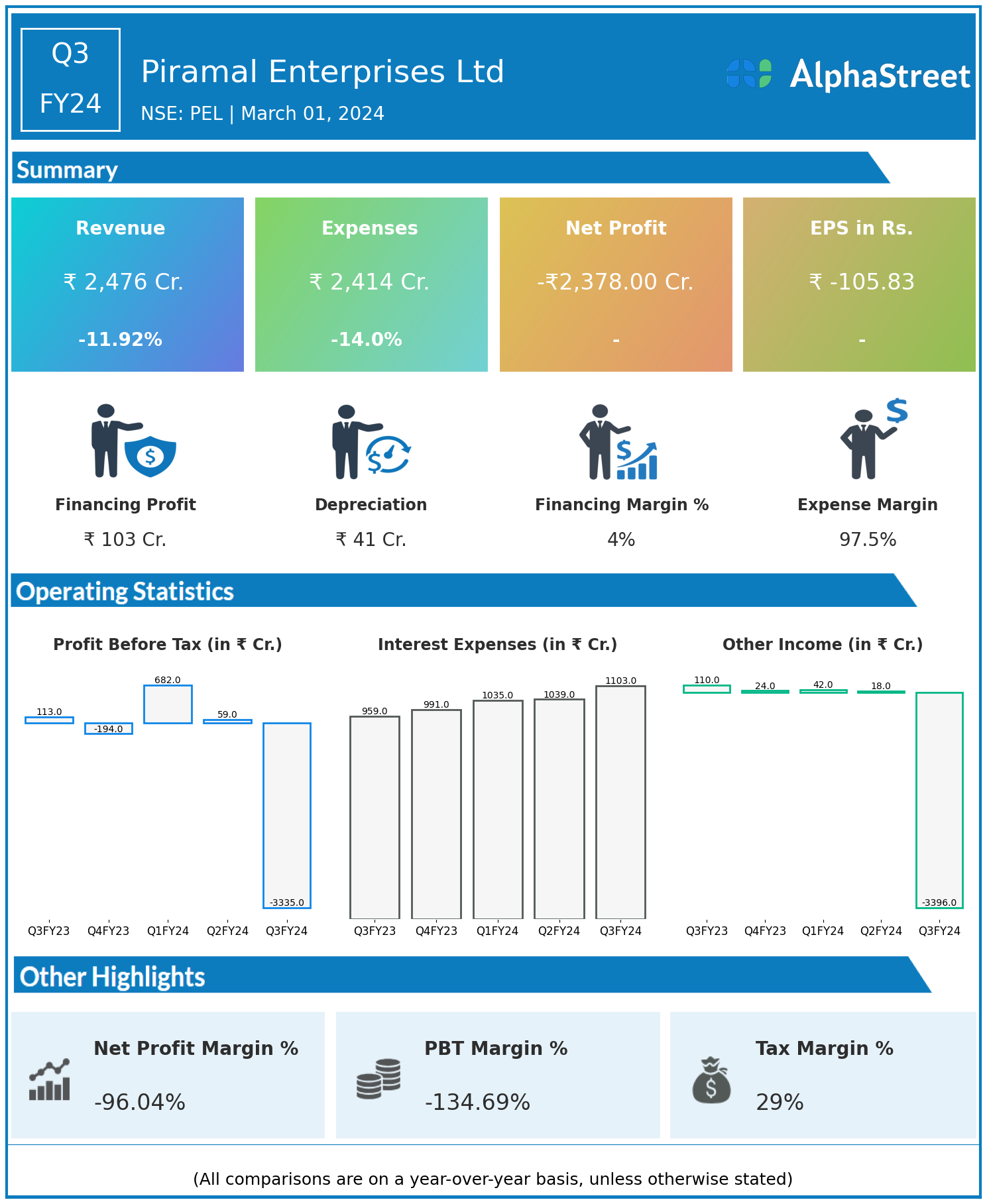 Piramal Enterprises Ltd reported Revenues for Q3FY24 of ₹2,476.00 Crores down from ₹2,811.00 Crore year on year, a fall of 11.92%.