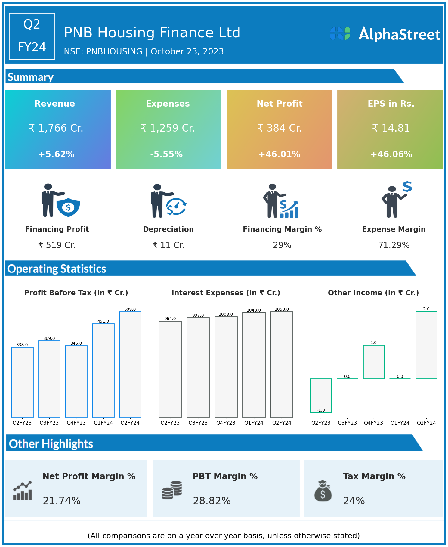 PNB Housing Finance Ltd reported Revenues for Q2FY24 of ₹1,766.00 Crores up from ₹1,672.00 Crore year on year, a rise of 5.62%.