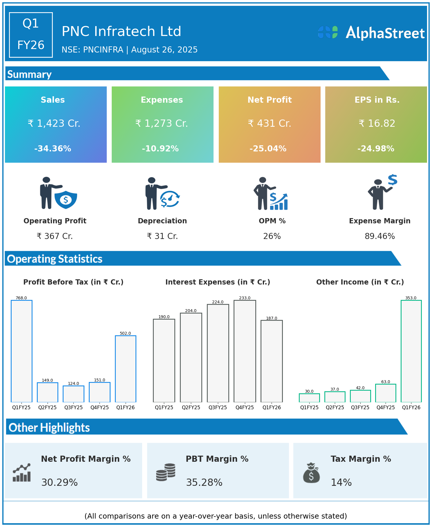 PNC Infratech Limited was incorporated on 9th August 1999 as PNC Construction Company Private Limited. The Company was converted into a limited company in 2001 and was renamed PNC Infratech limited in 2007. PNC Infratech Limited is one of the front-ending infrastructure development, construction, and management companies in the country. The company undertakes infrastructure projects, including highways, bridges, flyovers, power transmission lines and towers, airport runways, industrial area development, and other infrastructure activities. Presenting below are its Q1 FY26 earnings results.
