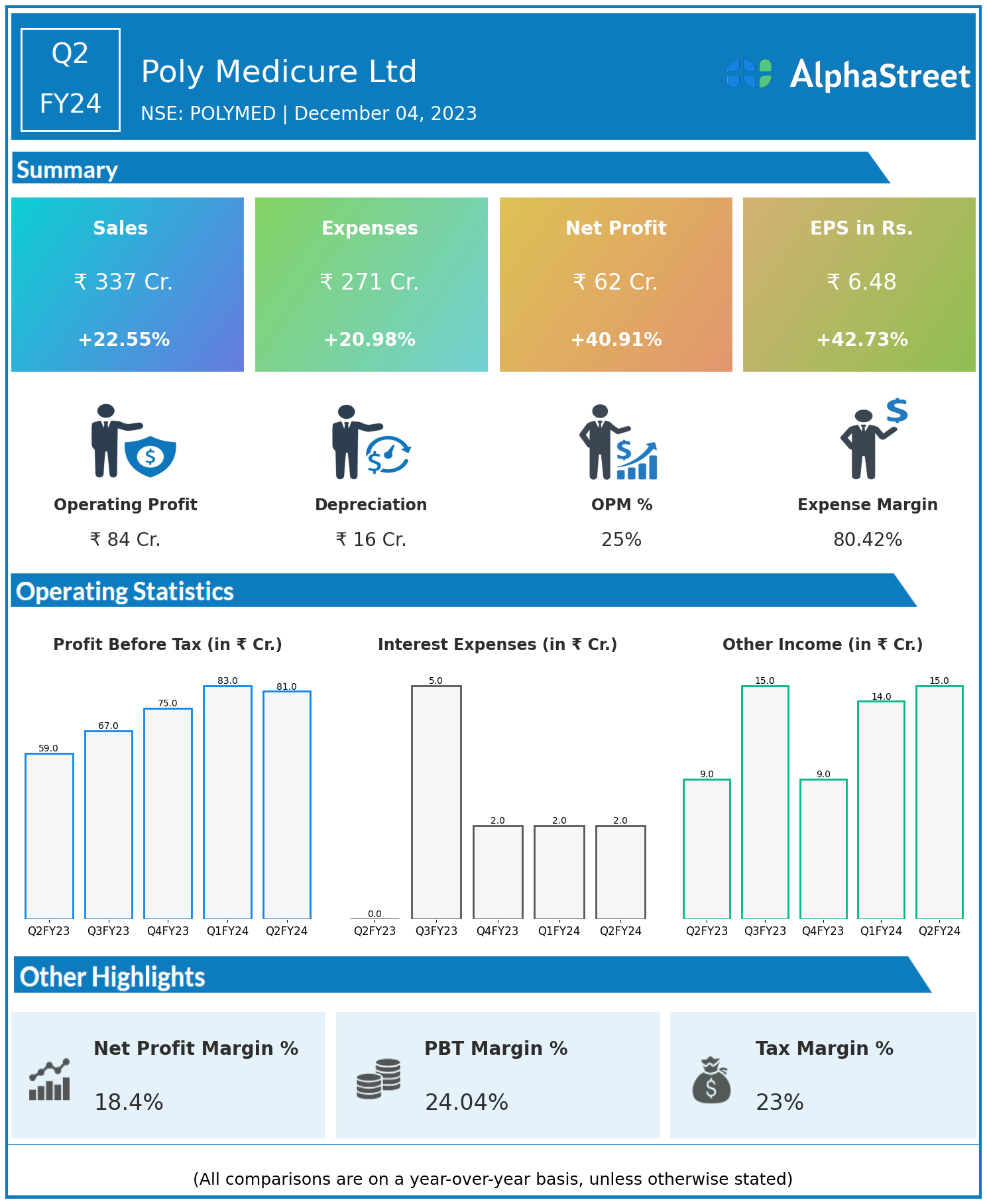 Poly Medicure Ltd reported Revenues for Q2FY24 of ₹337.00 Crores up from ₹275.00 Crore year on year, a rise of 22.55%.